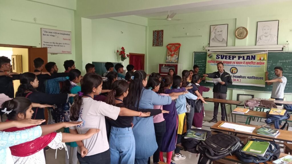 इसी कड़ी में शासकीय ई.वी.पी.जी. महाविद्यालय में आगामी नगरीय निकाय चुनाव में छात्र-छात्राओ की शत प्रतिशत भागीदारी सुनिश्चित करने हेतु उन्हें शसक्त लोकतंत्र के निर्माण में मतदान के महत्व की जानकारी दी गई एवं अनिवार्य रूप से मतदान करने हेतु संकल्प दिलाया गया।